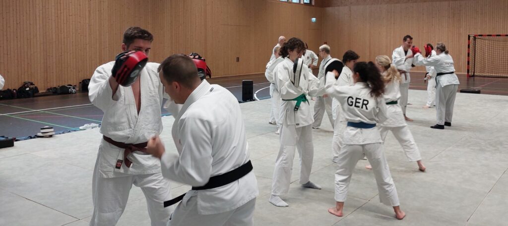 Das Fortbildungsprogramm deckte eine große Bandbreite ab – vom Techniktraining bis zur methodischen Arbeit. Die Teilnehmenden arbeiteten an Hebeltechniken am Boden, übten Stockabwehr und Selbstfallwürfe und wagten den Einstieg ins Fighting mit anschließendem Sparring. Ergänzt wurde das Programm durch weitere praxisnahe Themen, die den Transfer in den Trainingsalltag erleichterten. Die Referentinnen und Referenten gaben individuelle Rückmeldungen und praktische Hinweise, die direkt im Training umgesetzt werden konnten.