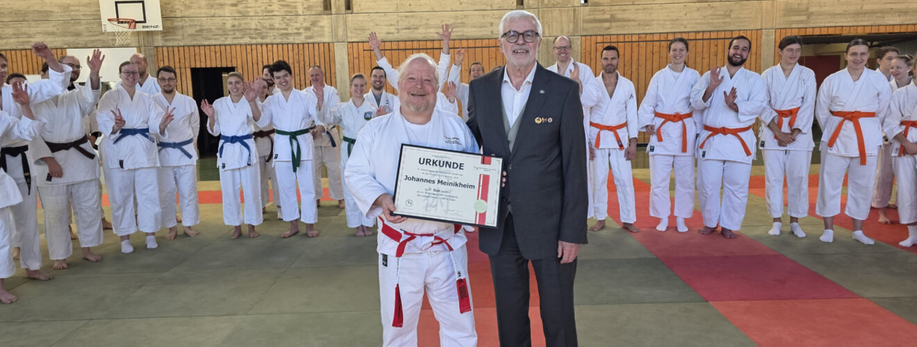Ein wichtiger Programmpunkt des Lehrgangs war die Auszeichnung von Hennes Meinikheim, dem ersten Vorsitzenden der Ju-Jutsu-Abteilung des TV Bad Mergentheim. Für die Verleihung des 7. Dan Ju-Jutsu war der Vorsitzende des Ju-Jutsu-Verbandes Württemberg, Volkmar Baumbast, persönlich angereist und hielt eine ausführliche Würdigung seines jahrzehntelangen Engagements.
