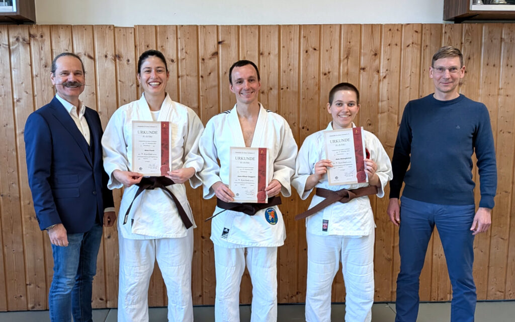 Die Prüfer Patrick Lange (7. Dan JJ) und Andreas „Ändy“ Schnelle (2. Dan JJ) sorgten von Beginn an für eine ruhige, konzentrierte Atmosphäre. Diese Gelassenheit übertrug sich schnell auf die Prüflinge: Nele Weingärtner (SC Denkendorf), Nina Frank und Jens Duggert (beide TSG Reutlingen).