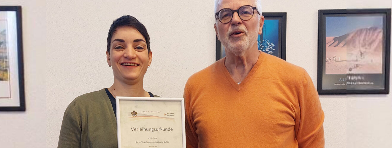 Der Ju-Jutsu Verband Württemberg e. V. hat Rebecca Menth mit der Ehrennadel in Gold ausgezeichnet. JJVW-Präsident Volkmar Baumbast überreichte die Auszeichnung im Rahmen der Vorstandssitzung in Merklingen.