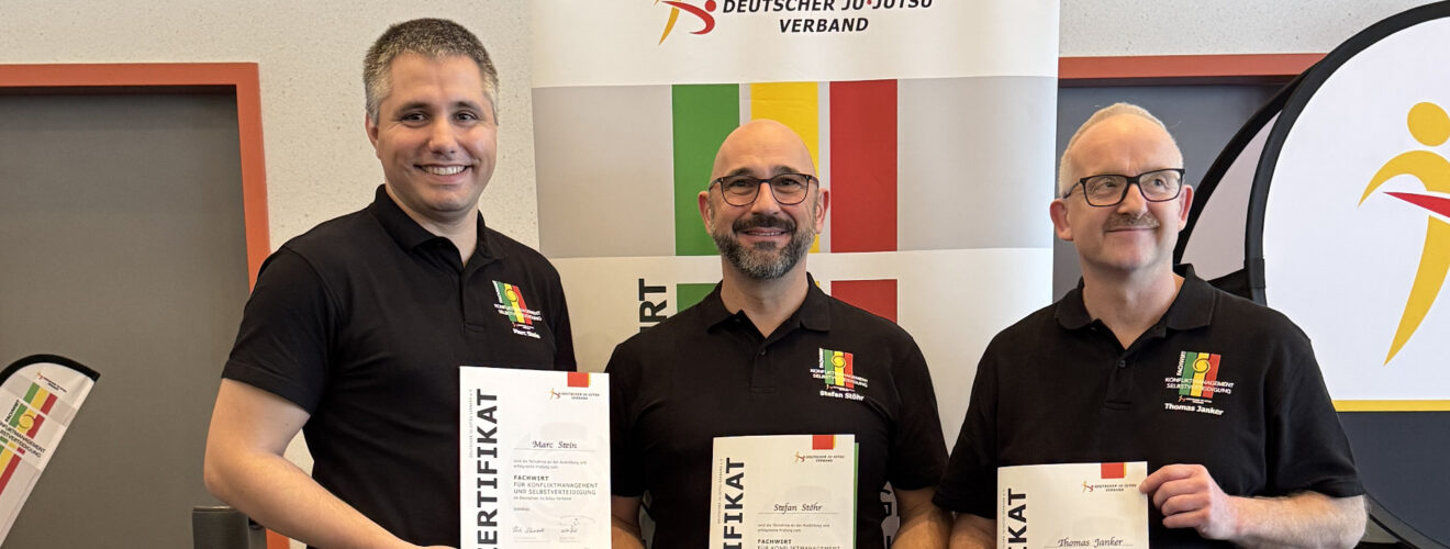 Vom Ju-Jutsu Verband Württemberg nahmen drei Kandidaten erfolgreich an der Prüfung teil und sind jetzt zertifizierte Fachwirte für Konfliktmanagement und Selbstverteidigung: Stefan Stöhr (Budokwai Steinheim), Thomas Janker (VfL Sindelfingen) und Marc Stein (JJC-Mühlbachtal).