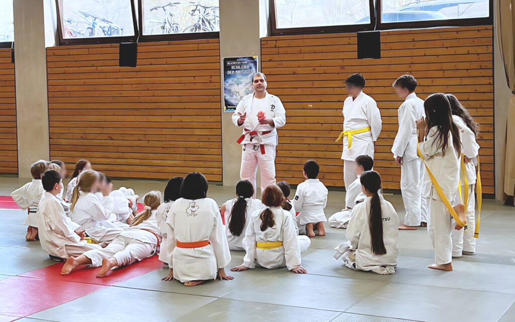 Referent war Enno Häberlein, 6. Dan Ju-Jutsu und Referent für Aus- und Fortbildung Jugend im Deutschen Ju-Jutsu Verband. Mitgebracht hatte er sein neues Lehrgangskonzept „Schleier der Mutigen“. Und das traf bei den Kindern ins Schwarze.