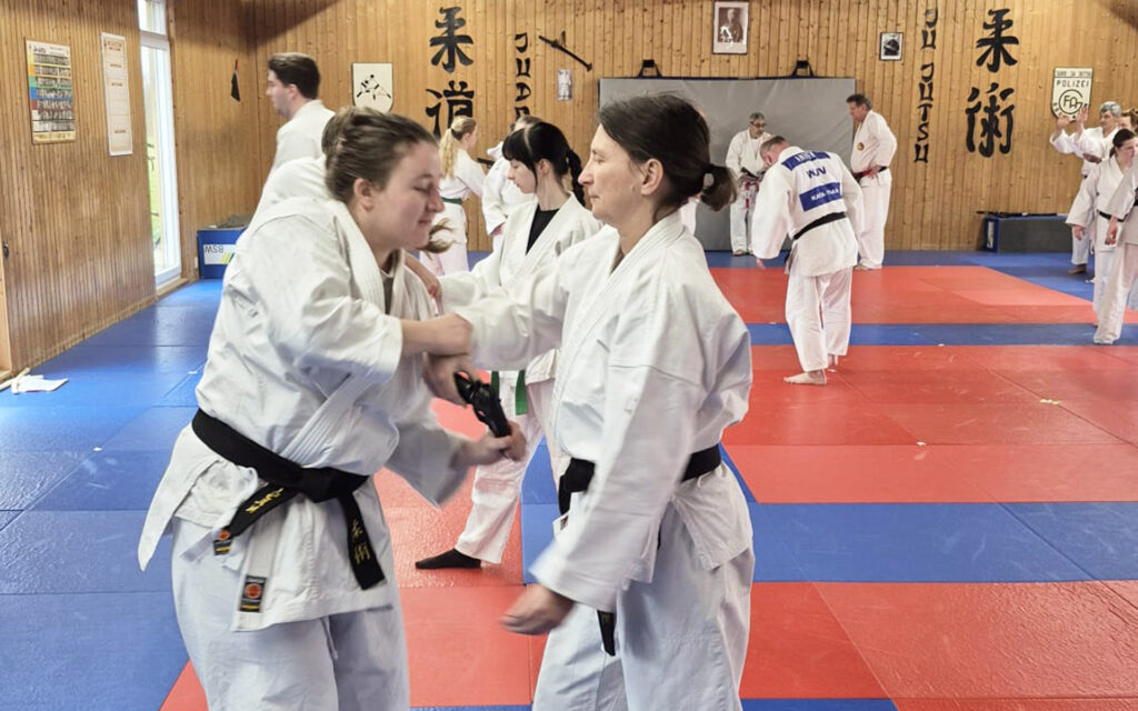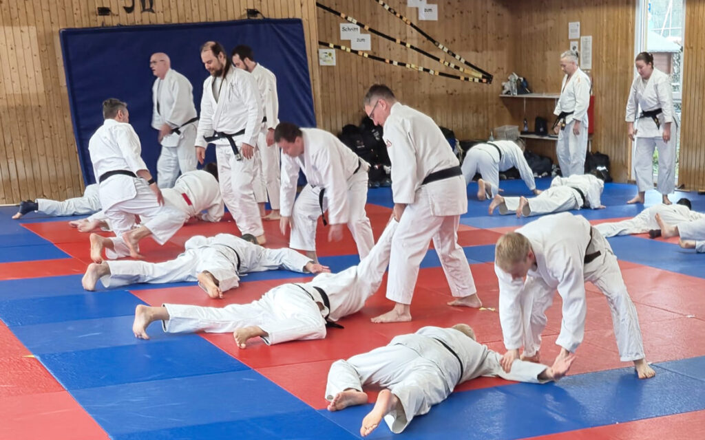 Giuseppe D’Amico (8. Dan Ju-Jutsu) und Andreas Schleicher (6. Dan Ju-Jutsu) führten durch die Kime-no Kata. Gleichzeitig trainierten Hennes Meinikheim (7. Dan Ju-Jutsu) und Laura Meinikheim (4. Dan Ju-Jutsu) mit den Teilnehmern die Goshin-jitsu-no Kata. Sie erklärten Abläufe, zeigten Varianten und gaben direkt Feedback auf der Matte.
